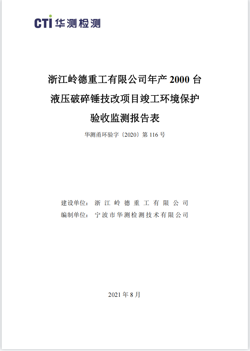 浙江嶺德重工有限公司年產(chǎn) 2000臺液壓破碎錘項目竣工環(huán)境保護驗收公示